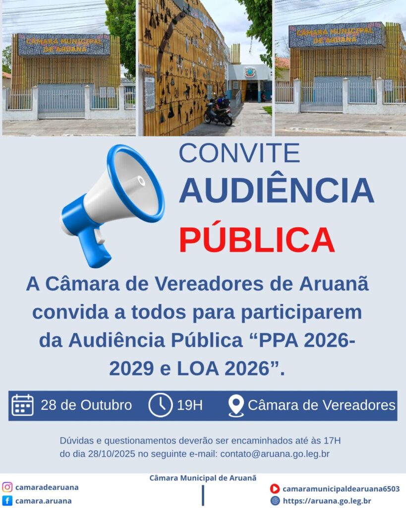 A Câmara Municipal de Aruanã convida toda a população para participar da Audiência Pública que será realizada no dia 28 de outubro (terça-feira), às 19h, no plenário da Câmara.